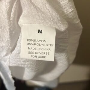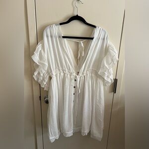 Elegant white dress with button-down front. Features a deep V-neck and ruffled sleeves. The pictures do nothing for this dress! You could use it as a cover up or a dress for a night out! This dress is stunning! There is a tie in the middle to tighten around the waist and one in the upper back because of the front v so deep!!! And it has pockets!