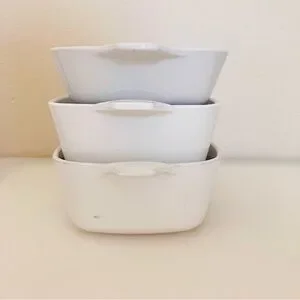 Each pan also serves as a cover due to clever designing of the handle tabs- see example shown in pics above.