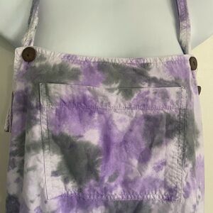 Vibrant tie-dye overalls with a mix of purple, blue, yellow, and pink. Perfect for a bold, casual look. Fully adjustable