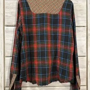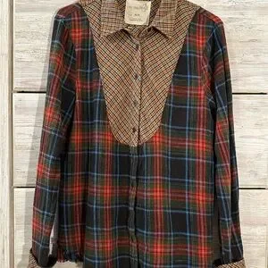 We The Free plaid button-up shirt; red, blue, & green plaid pattern; slightly fuzzy texture; soft