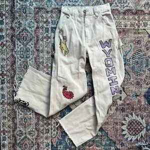 Stylish beige pants with Wyoming and western graphics. Features unique designs and frayed hems.