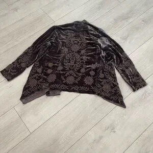 This elegant velvet jacket features a beautiful floral design, perfect for adding a touch of sophistication to any outfit. The rich brown color enhances its luxurious feel.