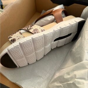 Stylish Cole Haan sandals with a snakeskin pattern and brown strap. Perfect for casual outings.