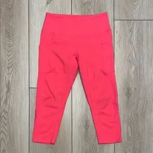These Yoga capri leggings feature a sleek, form-fitting design with a high waistband with side pockets. Crafted from a smooth and stretchy performance fabric. The vibrant coral color adds a pop of brightness, making them perfect for both athletic and casual wear.