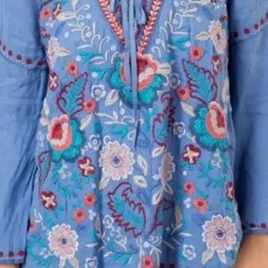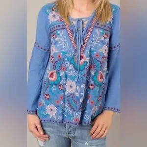 Johnny Was Oman Laceup Swing Blouse Embroidered Blue v neck small Top