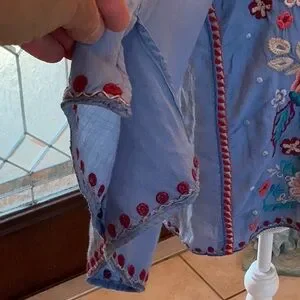 This Johnny Was Oman Lace up v neck blue blouse features intricate embroidery, perfect for adding a touch of elegance to your wardrobe. The bright blue Bell sleeve top is slightly cropped and has vibrant shades of knotted embroidery stitches, making up a beautiful floral pattern throughout the entire front of the top. Ideal for casual outings or special occasions.measures approx 19’ across (38’) & 22’ long Garment Bag #2