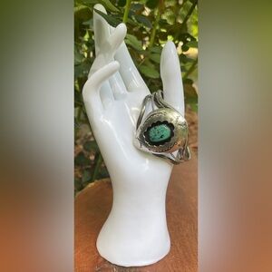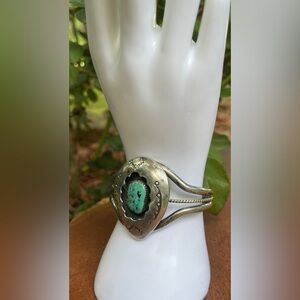 Hand crafted sterling silver cuff bracelet with Turquoise gemstone accent in a shadowbox design by unknown native American silversmith. Pictured as received from a local estate with undisturbed natural aged patina. Very good condition with minor wear indicative of age.