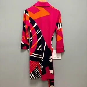 Stylish wrap dress with vibrant pink and orange patterns. Features a classic collar and tie waist. Perfect for any occasion.