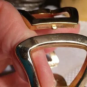 Goldtone metallic bracelet ,beautiful open triangles with one incrusted with rinestones. Has a hinged closure. No missing stones.
