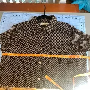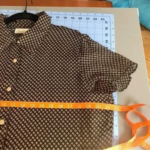 Stylish button-up blouse with a black and tan geometric pattern. Features short sleeves, a classic collar, and an integrated tank top. Lightweight & sheer.