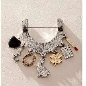 Add a little something special to every style with this stunning brooch featuring a textured metal piecing at top with dangly, whimsical charms at bottom for an added touch of luck.