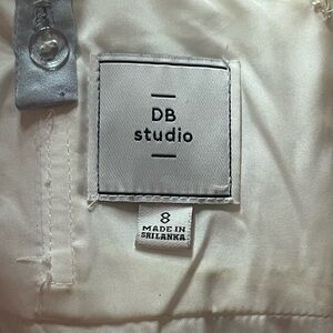 This elegant white dress is perfect for any elegant occasion. Its classic design offers a timeless look with its blue fluffy ribbon sleeves