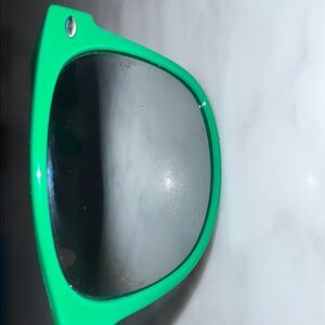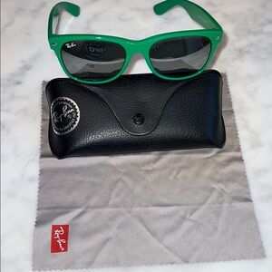 Stylish and durable, these Ray-Ban sunglasses feature a vibrant green frame and mirrored silver. Perfect for sunny days, they offer both protection and style. Black ray-ban leather case and gray cleaning cloth included.