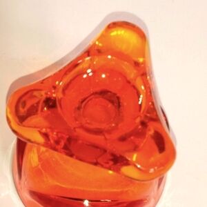 This vintage Viking Epic Drape compote is a beautiful addition to any collection. With its round shape and footed design, it's perfect for displaying fruit or candy. The glossy orange glass material is hand-blown, giving it an elegant and unique look. It would be an amazing bowl for ice cream sundaes.