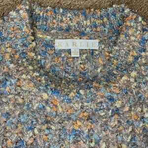 Cozy and Comfy Multicolored Popcorn Eyelash Knit Sweater. Metallic threading throughout give it a chic look. Slightly oversized for a relaxed silhouette. Can be dressed up for a night out or casually during the day. Sweater is a taupe color with silver metallic threads and pops of color throughout.