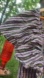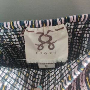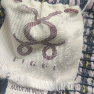 100% cotton smocked bodice with ruffle sleeves and peplum hem. Lilac with navy and thin yellow stripe. Super flattering!