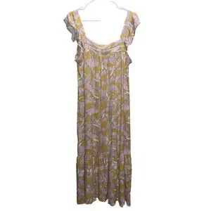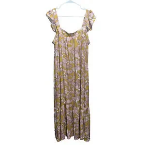 Knox Rose Womens Yellow Red Long Sun Dress L Flutter Sleeve Floral Cottage Core