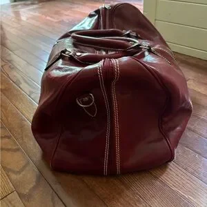 Elevate your style with this luxurious red leather travel duffel. Perfect for a weekend away, this bag combines elegance and functionality. Beautifully handmade and purchased in Florence, Italy. Used a handful of time, there are a couple of small scratches (see photos). Approximately 20 in long, 13 inches wide, and 10 inches tall. Like new condition.