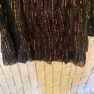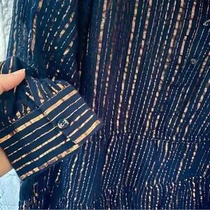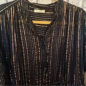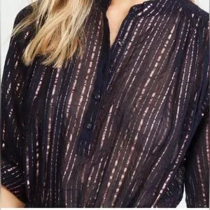Metallic stripes, drawstring, side ties, striped print, henley style, drawstring at waist, button at placket, lined