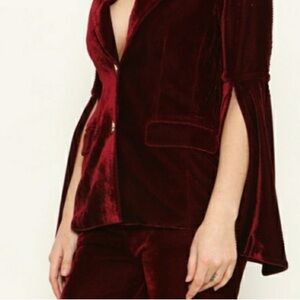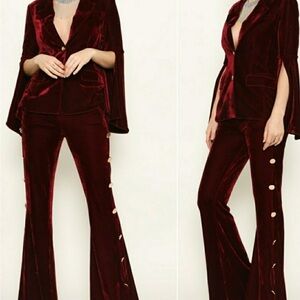 Reposhing this item I purchased from @modamecouture. A beautiful velvet 2pc set. The jacket has gold buttons with cape bell sleeves. The pants are flat front with wide legs adorned with gold buttons. Only worn once , excellent condition!