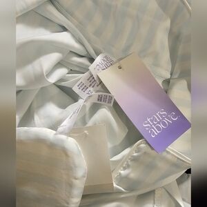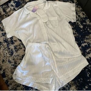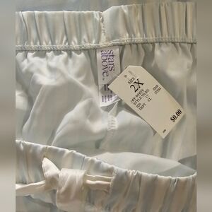New with Tags Stars Above 2 XL three piece womens pajama set. Relax in style with this elegant striped sleepwear set in lightweight satin fabric. Featuring a soothing white and light blue color palette, this set is perfect for a comfortable night's sleep. Measures 29 inches pit to pit, front front top, elastic waist shorts. Short bottoms measure 23 waist (laying flat) and 14 inches long. Matching eye mask included makes a great gift bundle! Ships from smoke-free and pet free home.