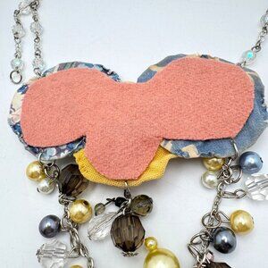 This handcrafted necklace features fabric yoyo flowers with beaded centers, complemented by multistrand beading. A thoughtful design blending soft textures and sparkling details.