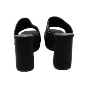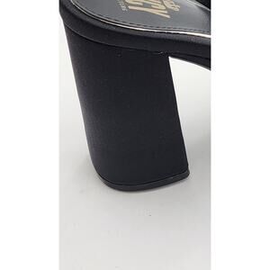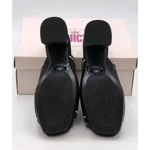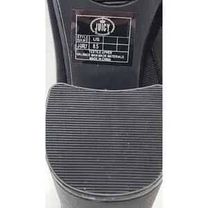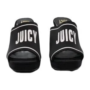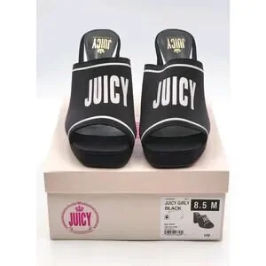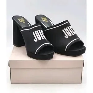 Elevate your style with these chic Juicy Couture Girly heeled sandals. The black and white color scheme, along with the iconic Juicy logo, make for a bold statement piece. The slip-on design and open toe make these sandals easy to wear for any occasion, whether it be a casual day out, a cocktail party, or even a trip. The ultra-high block heel adds a touch of sophistication and elegance to any outfit. These sandals are handmade with a comfortable textile upper and a solid pattern, making them perfect for any season. The shoes are a size 8.5 and have a medium width.