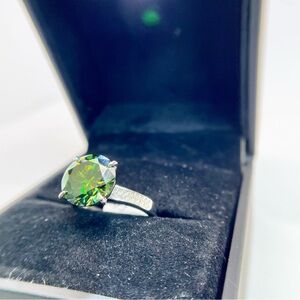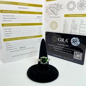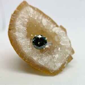 Timeless elegant with 5 carat moissanite ring. Featuring a radiant dark green round-cut center stone surrounded by a double row accent band, this piece captures the brilliance of a diamond at a fraction of the price. Brilliant Round Cut Genuine Moissanite Ring. Four Prong Setting with a Huge 5 carat center stone. Rare deep green color. Tested with a Gemoro Testerossa Professional Diamond Tester. Tests Positive. GRA Certificate Included.