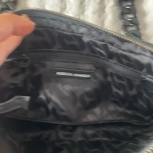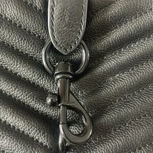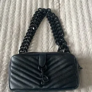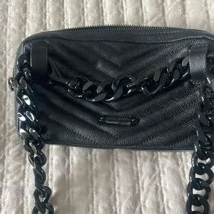 This elegant crossbody bag by Rebecca Minkoff features a sleek black design with a sophisticated quilted pattern. The bag is crafted from high-quality materials, offering both style and durability. Its versatile chain strap makes it perfect for any occasion, adding a touch of chic to your ensemble.