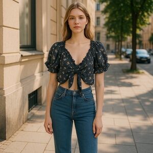 Brand new with tags! This romantic cropped top from American Eagle features a delicate black ditzy floral print, ruched puff sleeves, and a charming tie-front with a peek-a-boo cutout. Elastic at the neckline and back tie ensure a comfortable, flattering fit. Perfect for sunny days and festival styling.