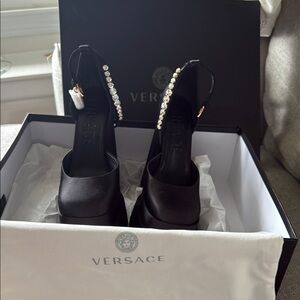 Elevate your style with these stunning Versace women's shoes. Featuring a sleek black design adorned with sparkling crystal accents, these shoes are perfect for any elegant occasion. Brand new, comes with everything box, cards and dust bag.
