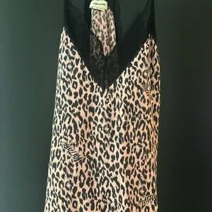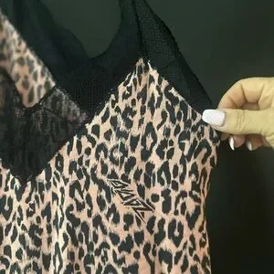 Chic leopard print camisole featuring elegant black lace details. A stylish addition to any wardrobe.