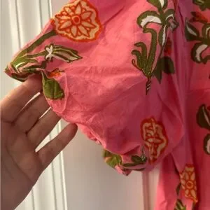 Vibrant pink dress featuring bold floral patterns. Puff sleeves add a stylish touch.