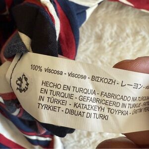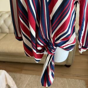 Stylish striped V-neck top featuring a blend of red, blue, and white colors. Perfect for casual outings or a day at the office.
