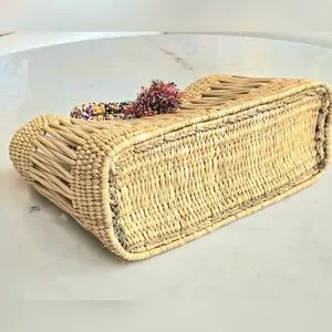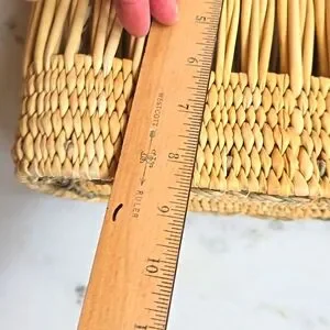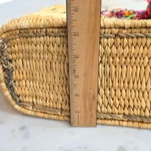 measurements: 14" wide at top 9" high. Bottom is 5.5" wide. 12" across at the bottom. Handle drop 5". A beautiful French straw wicker tote. New.
