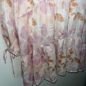 Chic floral dress by House of Harlow 1960 x REVOLVE. Features vibrant pink and orange patterns. Semi-sheer fabric with tiered skirt.