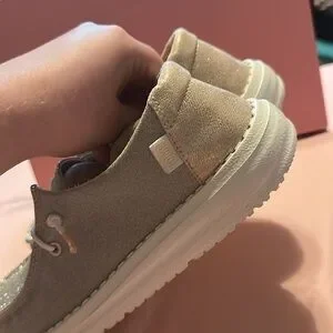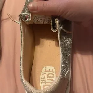 Stylish silver sparkly Hey Dude shoes with white laces. Perfect for everyday wear.