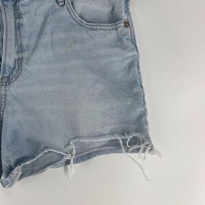 AMERICAN EAGLE Strigid Relaxed Fit Jean Shorts SIZE 14 Distressed Light Wash. 35" waist, 5" inseam. 12" rise. Good condition but has small makeup stain (see pics).