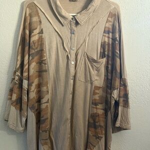 Stylish button-up top with camouflage pattern. Features a front pocket and relaxed fit. Perfect for casual wear. New without tags.