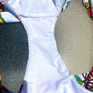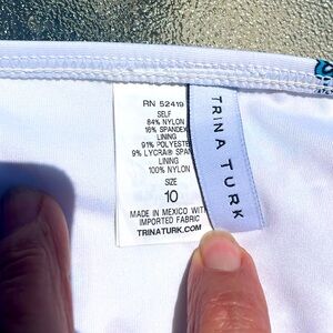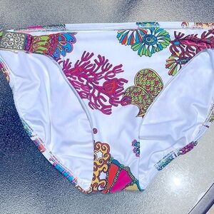 Make a splash in this vibrant Trina Turk bikini set. The multicolored print boasts a coral and flower theme, adding a touch of exotic charm to your swimwear collection. Tailored for women's size 10, this set is designed with both style and comfort in mind, boasting an opening for padding that can be added or removed for customizable support. Padding not included. I’ve included a picture of the crotch to show no signs of wear or discoloration.