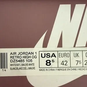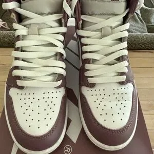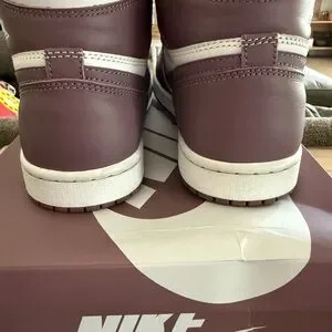 Classic Nike Air Jordan 1 Retro High OG sneakers. Features a mauve and white design. Ideal for sneaker enthusiasts. Men’s size 8.5 women’s 10. Never worn. Included are maybe laces.