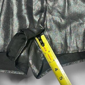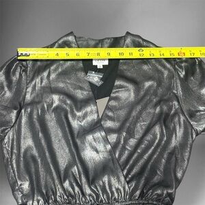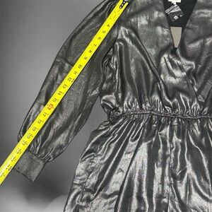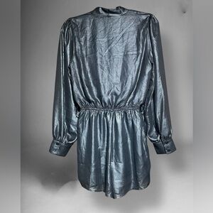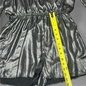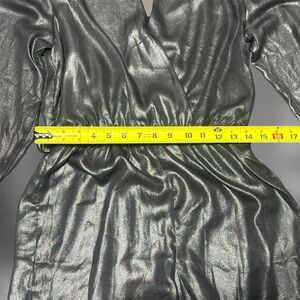 Shimmering metallic jumpsuit. Long sleeves with a deep V-neck. Elastic waist for comfort. Perfect for a night out.