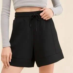 Experience ultimate comfort with Varley's black high-waist shorts, featuring a relaxed fit and a soft, knit-like material. These versatile shorts are perfect for lounging or casual outings, offering a clean and minimal design with a stylish cuffed hem.