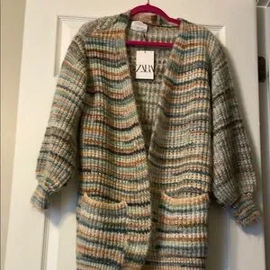 This cozy Zara cardigan features a chunky knit design in a blend of blue and brown tones. Its oversized fit and open front make it a perfect choice for layering during cooler days. The thick, textured knit ensures warmth and comfort, while the vintage-inspired color scheme adds a touch of retro charm.