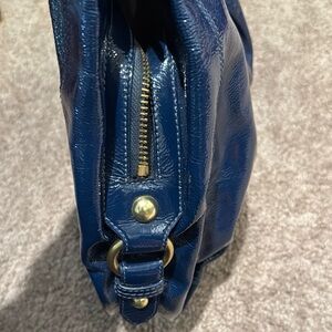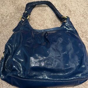 This Coach hobo bag in a striking blue hue features a slouchy silhouette with elegant ruched detailing, crafted from soft, glossy leather. Its generous size and curved shoulder strap make it perfect for everyday use, while the dark hardware adds a touch of sophistication.