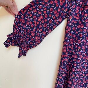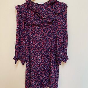 Elegant Sandro Paris Silk dress with vibrant floral pattern. The navy blue fabric is beautiful. Features delicate ruffles. Ideal for stylish outings.
