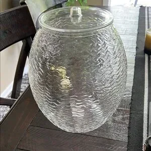 Approx 12 inches in height. Used once for a baby shower. This exquisite piece by Opalhouse showcases a stunning clear and gold color palette. The intricate crackled texture gives it a frosted, crystalline appearance, making it a captivating decorative item. Its unique design not only enhances its aesthetic appeal but also highlights the artistry involved in its creation. Non glass dispenser.