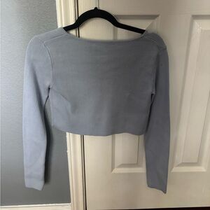 This stylish top from Brandy Melville features a modern cropped design with long sleeves and a button-down front. The soft blue-gray color and minimalist style make it a versatile piece for casual wear or layering. Crafted from a comfortable knit fabric, it offers a slim fit and a clean, simple look.