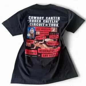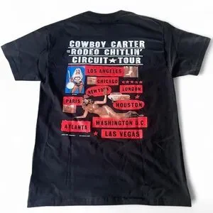 Unofficial tour merch from the Cowboy Carter Rodeo Chitlin’ Circuit Tour. Brand new, never worn. Features a bedazzled rhinestone-studded “BEYONCE” across the chest and and full tour cities listed on the back.