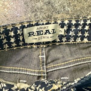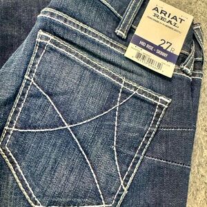 These Ariat boot cut jeans in a classic blue hue feature a medium-dark wash with natural fading and whiskering patterns, offering a vintage, lived-in look. The denim transitions from darker to lighter tones, enhancing depth and dimension. Ideal for a stylish, casual appearance. NEW WITH TAGS! Mid rise!